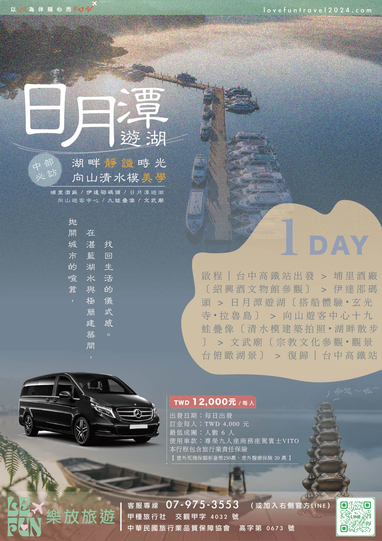 從台中高鐵優雅啟程,首站來到紹興原鄉「埔里酒廠」,在微醺香氣中開啟旅程。隨後抵達日月潭伊達邵碼頭品嚐在地風味,並搭乘專船遊湖,從水路視角仰望拉魯島與玄光寺。午後漫步於清水模建築美學的向山遊客中心,尋找驚喜的九蛙疊像,最後在文武廟的觀景台俯瞰整片湛藍湖景。全程賓士包車到府接送,讓您無需煩惱停車與交通,專注享受南投的山水之美 .ᐟ.ᐟ.ᐟ(若欲規劃兩日遊或入住飯店請洽業務,另有散拼團,6人成行)