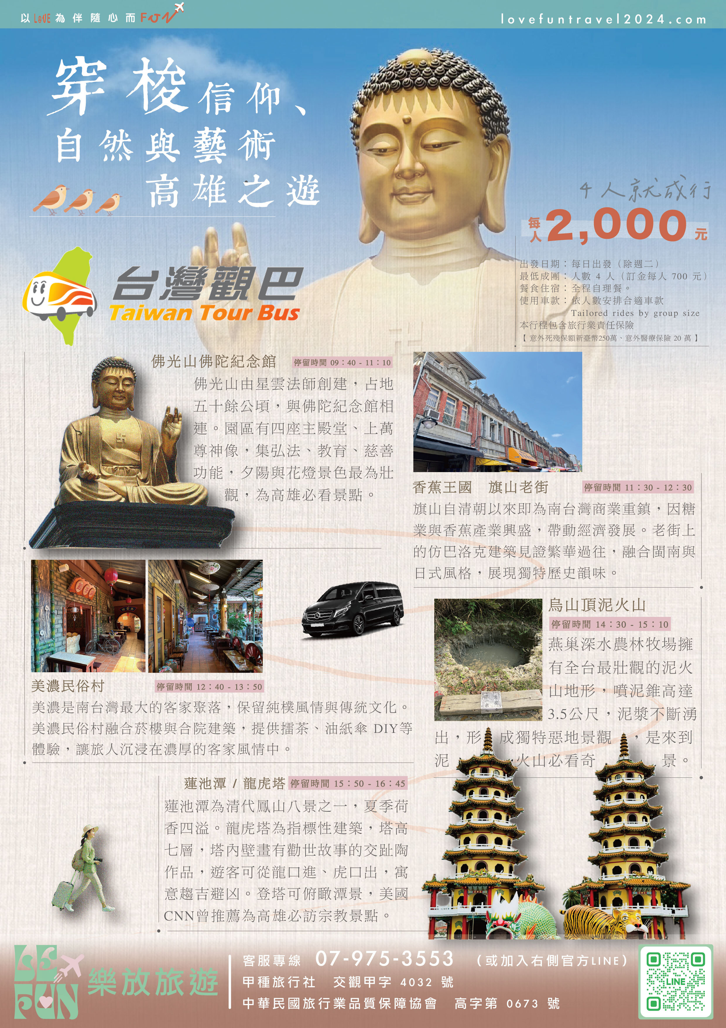 【 台灣觀巴 ⟡ 精選路線 】在高雄的佛陀紀念館和蓮池潭龍虎塔感受信仰洗禮,漫遊旗山老街品味香蕉風味,體驗美濃民俗村的客家擂茶,探索烏山頂泥火山的自然奇觀.全程由賓士專車到府接送,讓您品味高屏山城的藝術文化旅行的美好 .ᐟ.ᐟ.ᐟ( 若遇未開團日期請洽業務,另有散拚團,4人成行 )