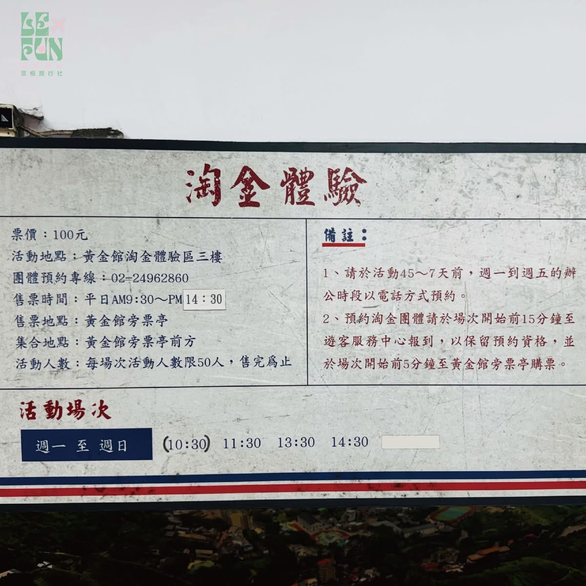 啟程 ⟡ 出發 ⇀ ✩ 礦山傳奇 ♡ 新北黃金博物館〖摸 220kg 大金磚・金瓜石神社遺址俯瞰美景〗 ⇀ 淘金體驗 ♡ 黃金博物館淘金趣〖親手製作專屬小金沙〗 ⇀ 藝術足跡 ♡ 祈堂老街〖彩虹階梯・迷宮般的懷舊山城〗 ⇀ 美食巡禮 ✩ 九份老街〖芋圓小吃・阿妹茶樓賞夜景〗 ⇀ 復歸 ⟡ 飯店或溫暖的家