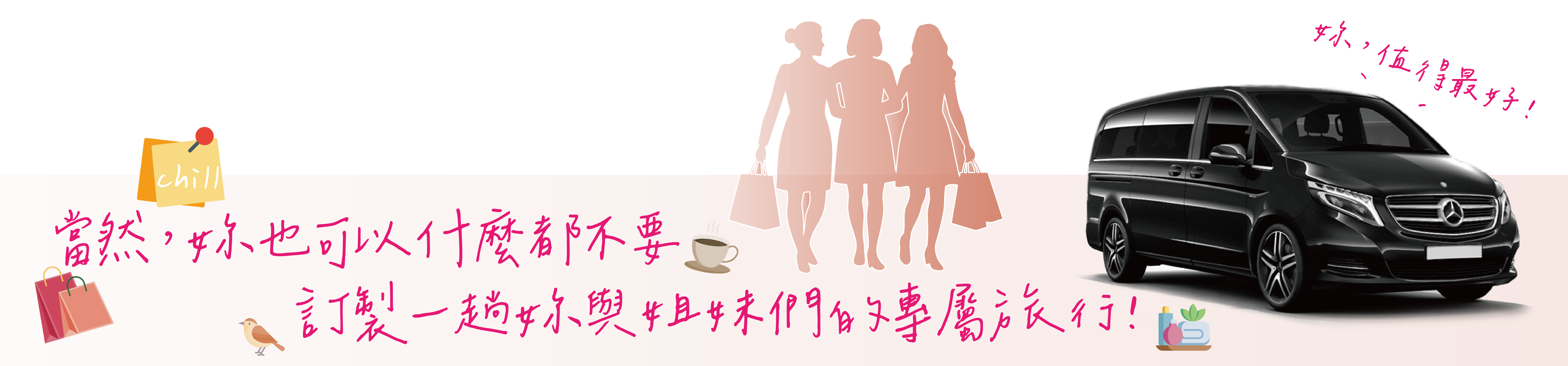 | 樂放旅遊包車 | 點對點直達,司導預先停妥車輛 | 車內隨時補妝、換裝,下車即名模 | 台北九人座包車寬敞舒適,專屬空間 |