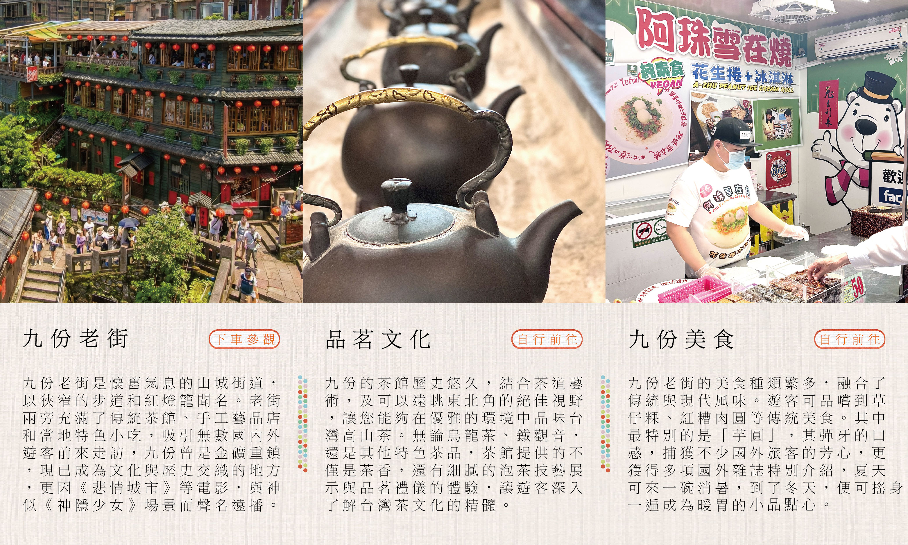 從台北車站優雅啟程,首站來到「十分老街」的鐵道旁,親手寫下心願,讓天燈帶著祝福冉冉升空迎接,接著與全台最寬的「十分瀑布」相遇,感受水氣帶來的負離子洗禮,中午來到「九份老街」的紅燈籠與茶香中,尋找如電影般的慢活時光。午後則轉往「黃金博物館」觸摸百年金礦的歷史餘溫,最後來到瑞芳最具張力的「陰陽海」調色盤,感受大自然的鬼斧神工。全程賓士包車到府接送,免去轉乘與找車位的煩惱,讓您與閨蜜專注於這場復古與浪漫交織的旅行 .ᐟ.ᐟ.ᐟ(若欲規劃多日遊或客製化行程請洽業務,另有散拼團,6人成行)