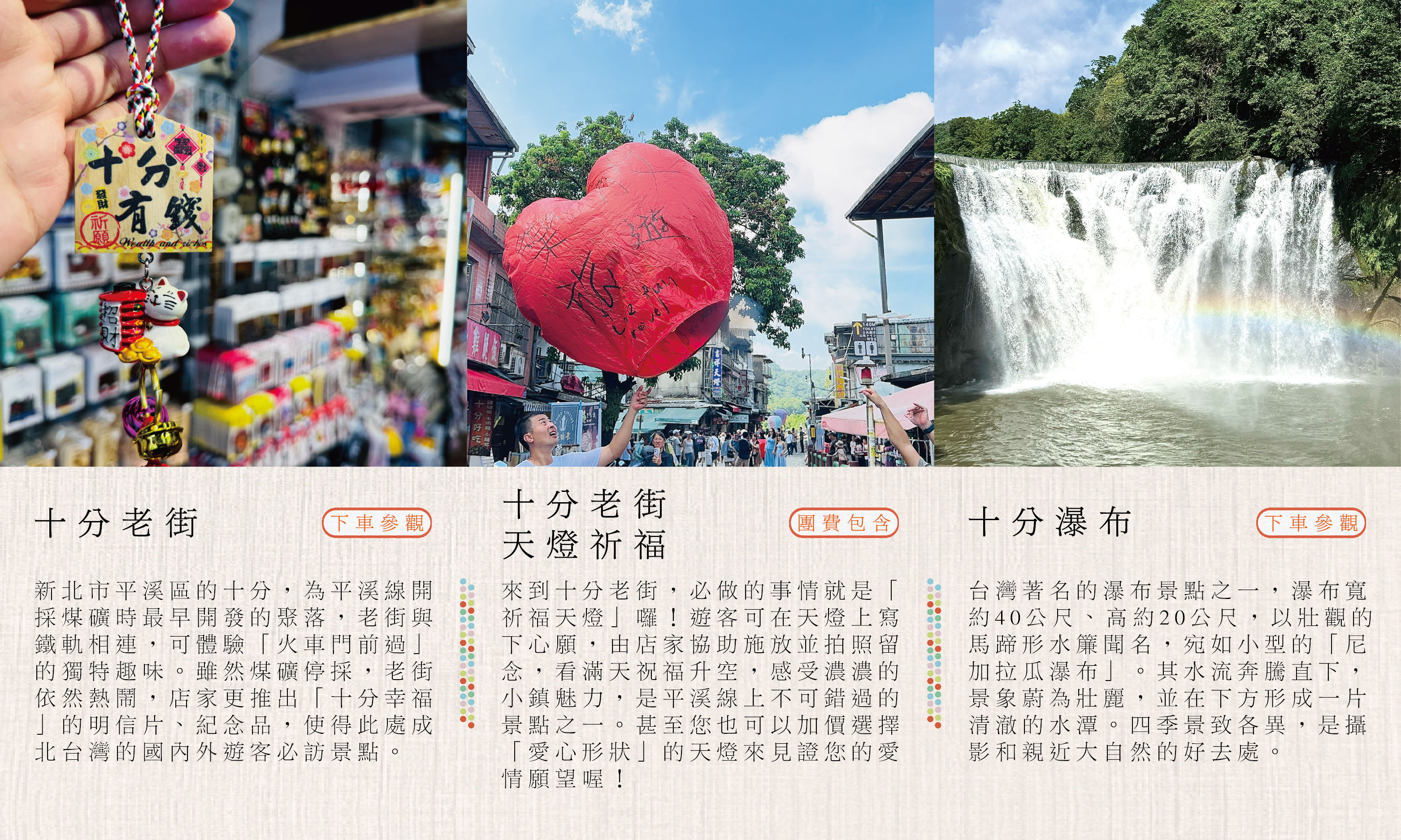 從台北車站優雅啟程,首站來到「十分老街」的鐵道旁,親手寫下心願,讓天燈帶著祝福冉冉升空迎接,接著與全台最寬的「十分瀑布」相遇,感受水氣帶來的負離子洗禮,中午來到「九份老街」的紅燈籠與茶香中,尋找如電影般的慢活時光。午後則轉往「黃金博物館」觸摸百年金礦的歷史餘溫,最後來到瑞芳最具張力的「陰陽海」調色盤,感受大自然的鬼斧神工。全程賓士包車到府接送,免去轉乘與找車位的煩惱,讓您與閨蜜專注於這場復古與浪漫交織的旅行 .ᐟ.ᐟ.ᐟ(若欲規劃多日遊或客製化行程請洽業務,另有散拼團,6人成行)
