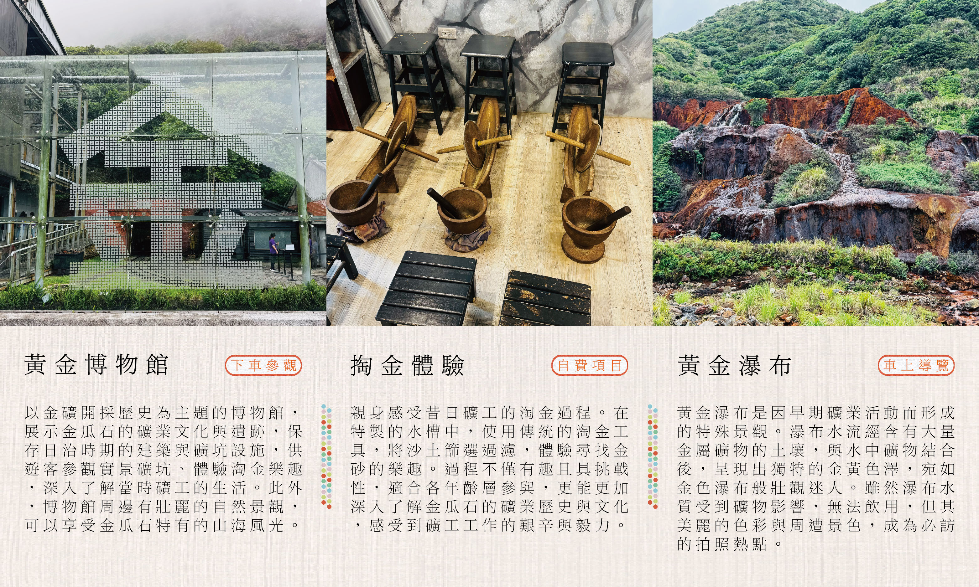 第一天 𝐹𝑖𝑟𝑠𝑡 𝐷𝑎𝑦啟程 ⟡ 台北火車站 ⇀ 鐵道願望 ♡ 十分老街〖祈福天燈・鐵道懷舊〗⇀ 台版尼加拉瀑布 ♡ 十分瀑布〖震撼負離子芬多精〗⇀ 霧色山城 ♡ 九份老街〖茶藝文化・懷舊散策〗⇀ 淘金歲月 ♡ 黃金博物館〖觸摸 220kg 純金磚〗⇀ 自然調色盤 ♡ 水湳洞陰陽海〖奇幻山海美景〗⇀ 復歸 ⟡ 台北火車站